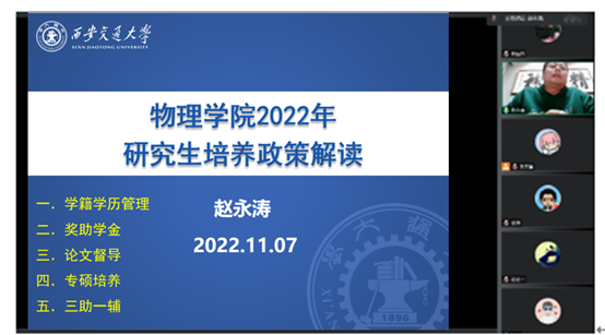 首先由赵永涛副院长为同学们介绍JDB电子官方网站研究生培养管理政策。他重点就研究生学籍学历管理规定、奖助学金、论文督导、专硕培养、三助一辅五个方面为同学们详细讲解了学院研究生培养管理政策。他强调学位论文是研究生学习、科研、实践的重要组成部分,鼓励同学们一定要端正自己的科研态度,培养良好学风,学有所得,写出合格的高质量的学位论文。